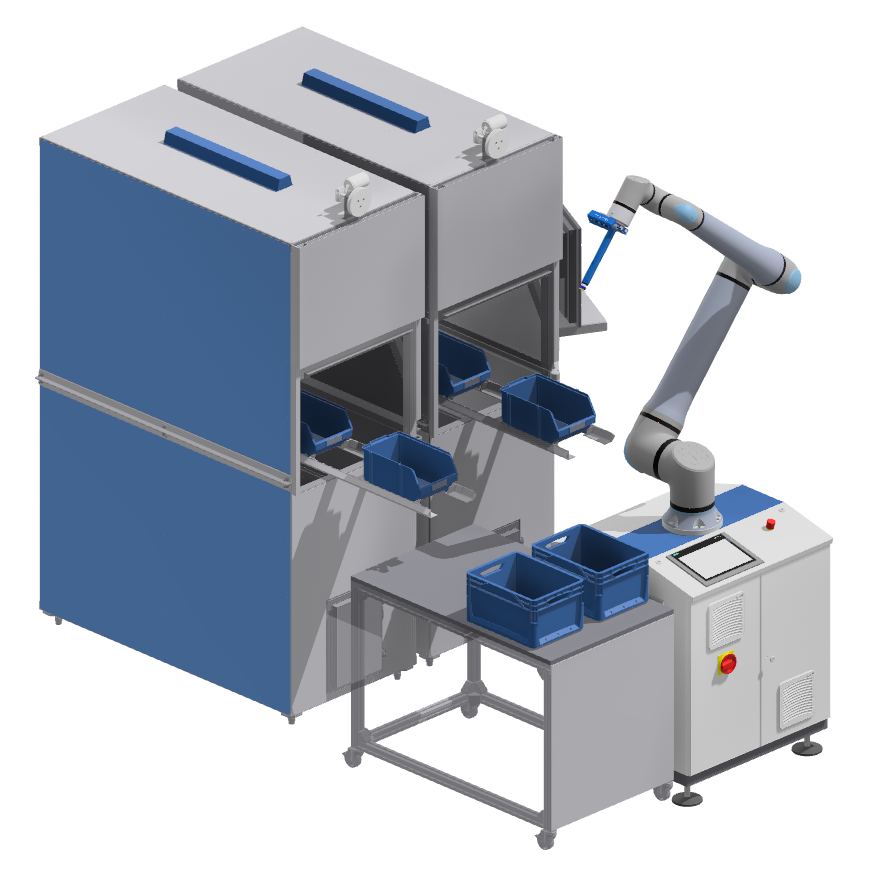 Unsere Cobots kombinieren fortschrittliche Sensorik, intelligente Bildverarbeitung und adaptive Greiftechnologien, um unterschiedlichste Teile sicher und zuverlässig aus Behältern, Boxen oder Kisten zu entnehmen – selbst wenn diese unsortiert oder in unregelmäßigen Positionen liegen.