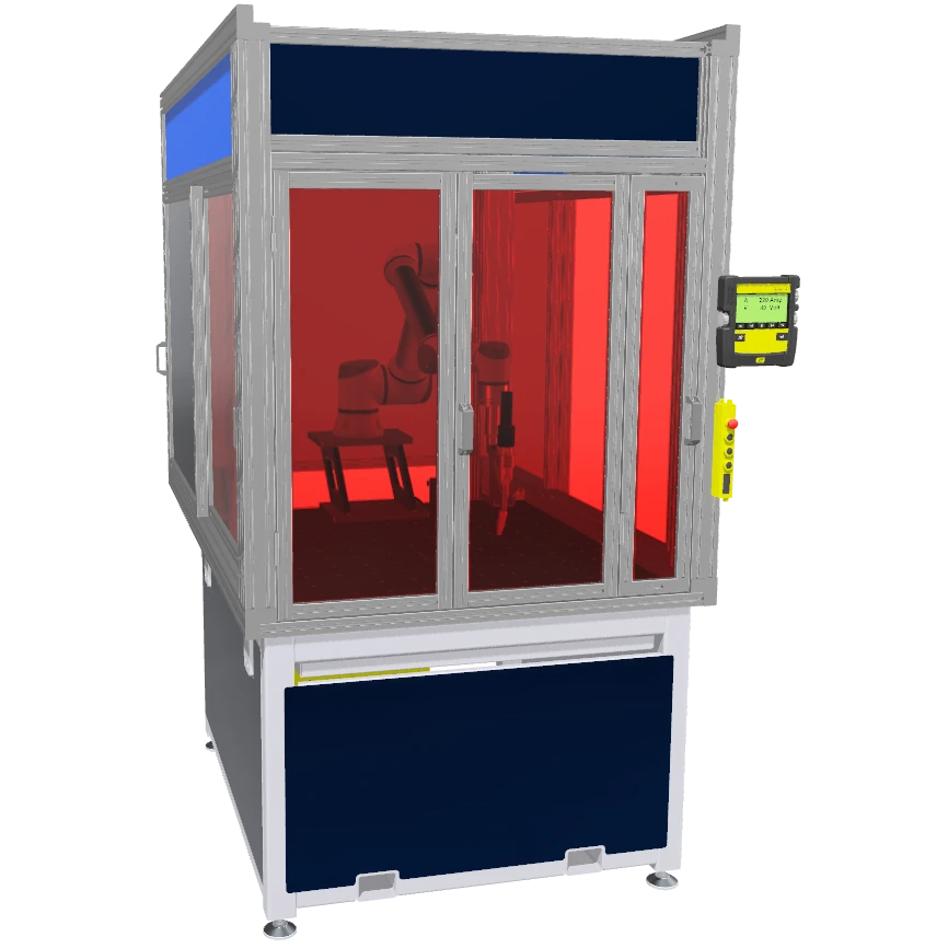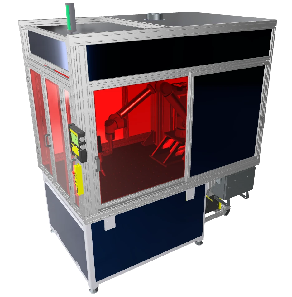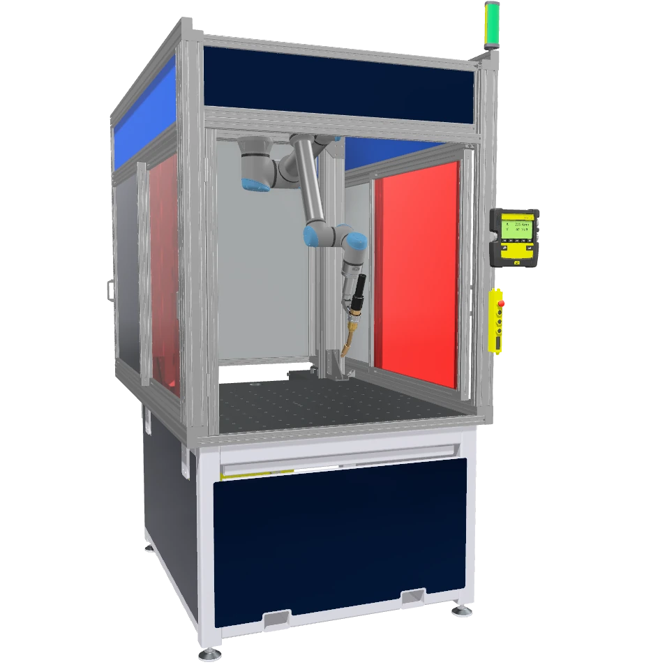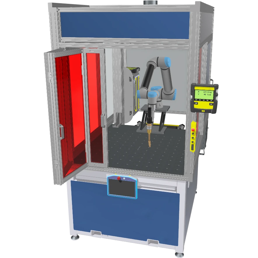 Eine kompakte und sichere Lösung für die Automatisierung von Schweißprozessen. Die Schweißzelle mit integriertem Cobot, der in einem geschützten Arbeitsbereich agiert.